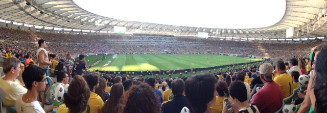 Tivemos que enfrentar uma fila chata para entrar no estádio, porque as catracas estavam dando vários problemas, mas chegamos tranquilamente no nosso assento, sem muito stress. Saímos às 14h de Ipanema e as 15h30 estávamos dentro do estádio.