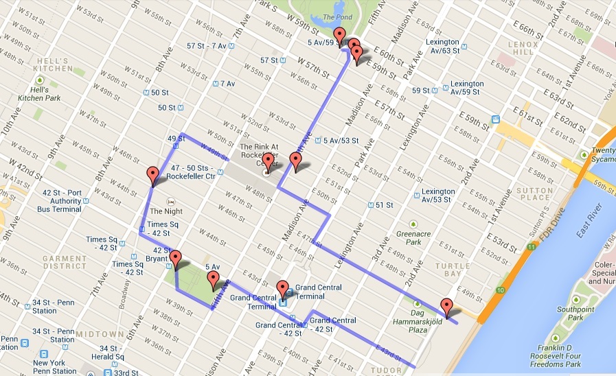 O ponto de início é na 5th Ave com a 59th St, onde encontramos o chiquérrimo hotel The Plaza, a deslumbrante loja da Apple e a impressionante loja de brinquedo FAO Schwarz.