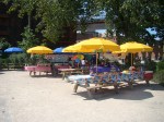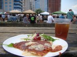 Para chegar no Smorgasburg não tem erro. Quando você descer da barca, vire a esquerda que você vai dar na feira. E chegue cedo se não quiser ficar com o resto! hehe Eu e o Nando fizemos isso! Chegamos por volta de 12h e a feira já estava cheia. Passeamos um pouco pelas barracas, vimos uma por uma e escolhemos barracas diferentes para comer. Eu comi um prato italiano que não tinha erro : um queijo típico do norte da Itália gratinado com batata e salada. Estava tão delicioso que eu repeti! Afinal, nas férias pode tudo! Já o Nando pediu um nacho mexicano, que parecia estar muito bom também.