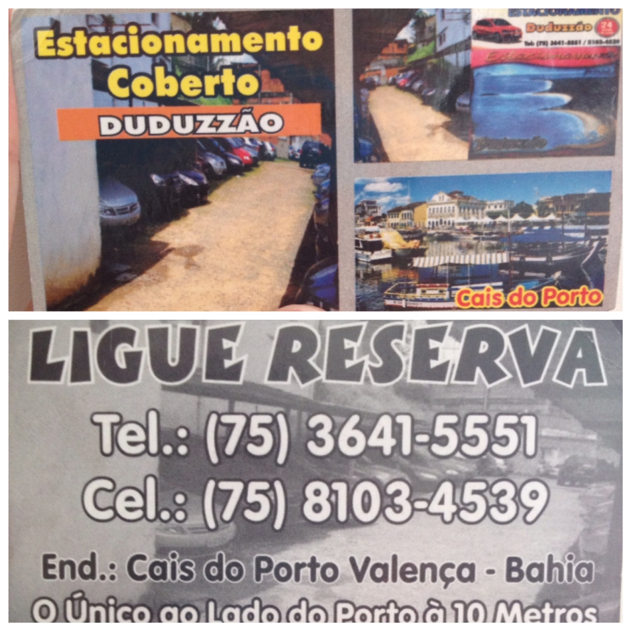 Em Camamu, estacionamos o carro no “Estacionamento Jamaica”. Quando você entrar na cidade, mais próximo ao cais, você já vai ver placas indicando este estacionamento. Porém, é preciso ligar para o Delis (telefone: (73) 9962-0740 ou (73) 8105-5655) antes ou achá-lo no shoppingzinho do Mercado Público, que fica bem ao lado do cais, pois ele quase nunca está no estacionamento durante o dia. O Delis foi muito atencioso e gostei do atendimento dele, apesar do estacionamento não ser tão perto como em Valença (mas fomos andando para a cais). Os preços da vaga são iguais do de Valença, ou seja, R$15,00/dia vaga descoberta e R$20,00/dia vaga coberta, deixando a chave com o condutor.